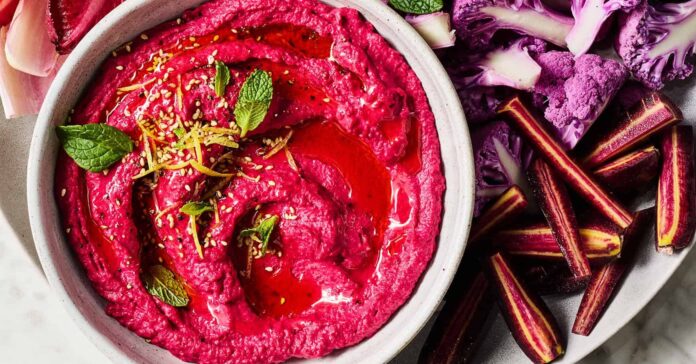 Z tego przepisu powstaje oszałamiająco piękny i niesamowicie pyszny hummus z buraków, idealny na zdrową przekąskę lub efektowną przystawkę. Jasnoróżowy odcień zawdzięcza pieczonym burakom zmieszanym z klasycznymi składnikami hummusu, takimi jak ciecierzyca, tahini, czosnek i sok z cytryny. Rezultatem jest dip, który jest subtelnie słodki, ziemisty i nieodparcie gładki.