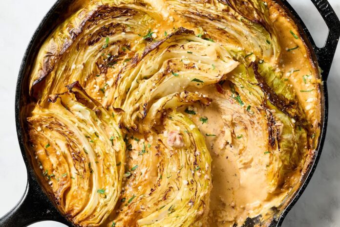 Kluczem jest równowaga: obsmażanie, aby wydobyć słodycz, a następnie gotowanie na wolnym ogniu w pysznym sosie bogatym w umami dzięki suszonym pomidorom, parmezanowi i odrobinie serka śmietankowego. Rezultatem jest delikatna, aromatyczna kapusta, która pięknie wchłania sos, tworząc danie o wiele bardziej wyrafinowane, niż mogłyby sugerować skromne składniki.