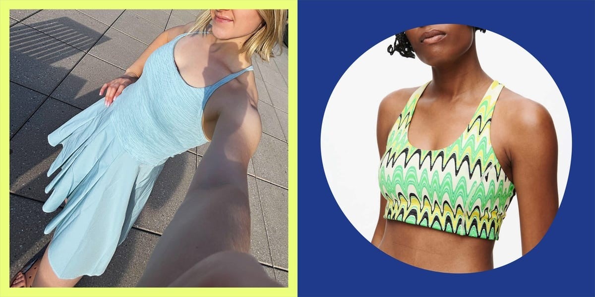 - Спортивное платье Blue Dust Multi — любимый выбор для долгих прогулок. Оно легкое, имеет внутренние карманы для телефона, но не подходит для силовых тренировок.